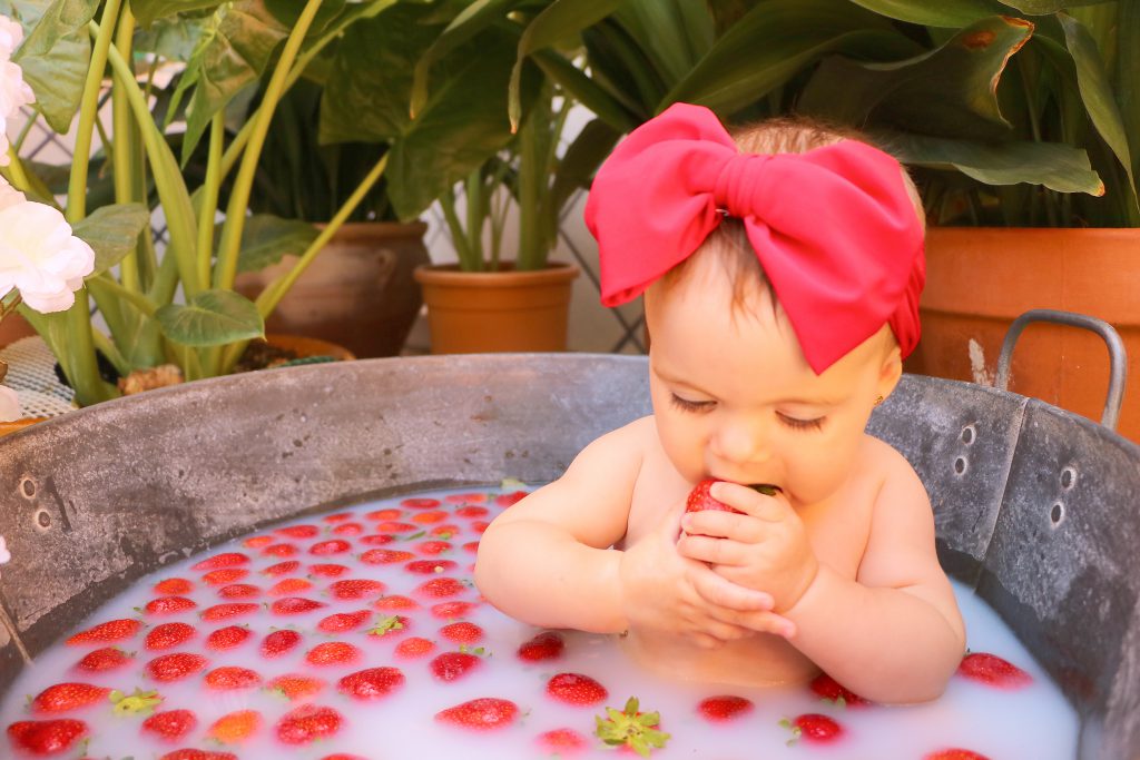 El lazo de la cabeza todavía hace más graciosa está sesión de verano y la leche mezclada con el agua le da un tono que hace un contraste fantástico con el color rojo.